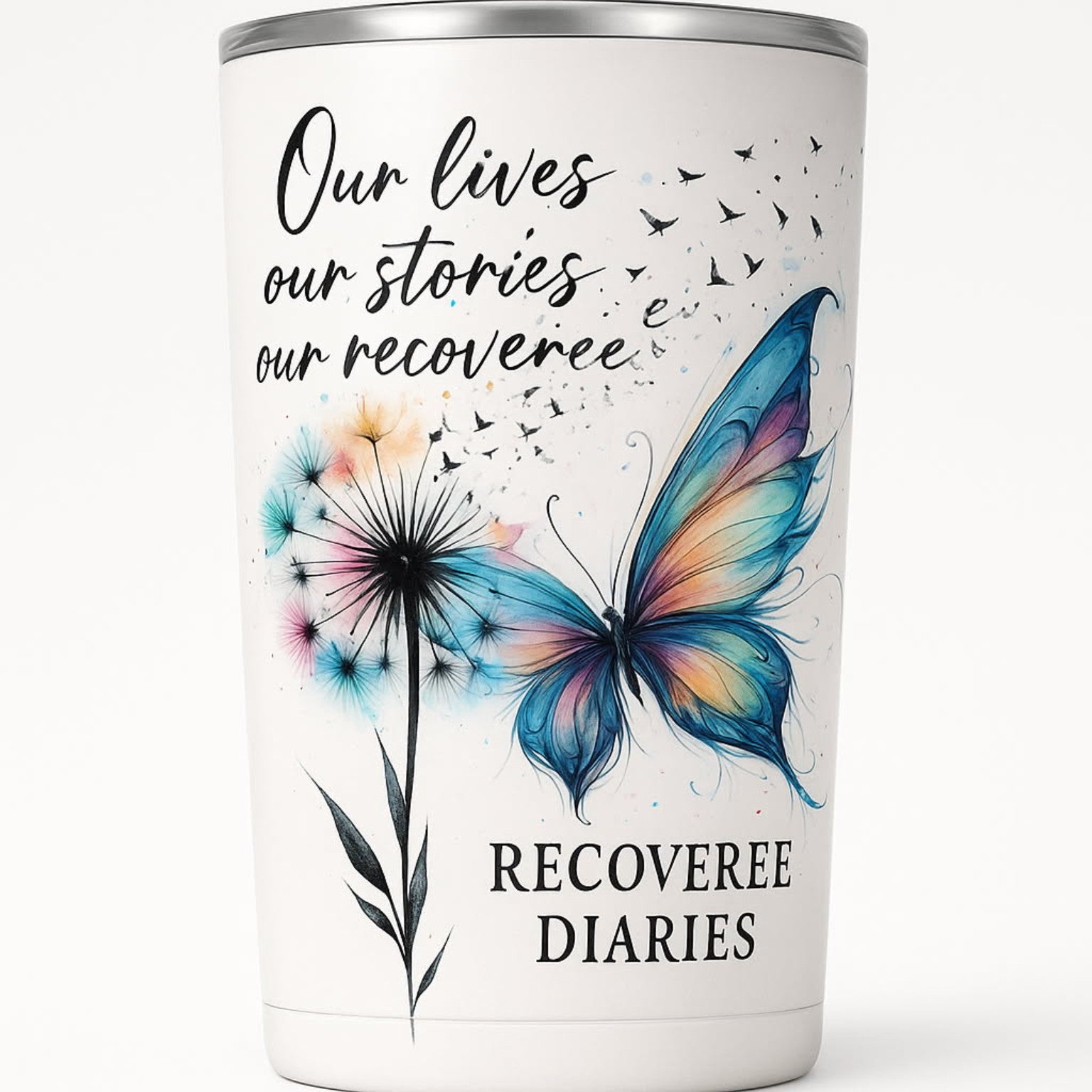 The Recoveree Diaries Butterfly Tumbler is more than just drinkware — it’s a reminder of growth, healing, and the beauty that comes from transformation. Featuring a stunning pastel butterfly, flying birds, and your signature Recoveree Diaries branding, this tumbler carries the energy of hope everywhere you go.